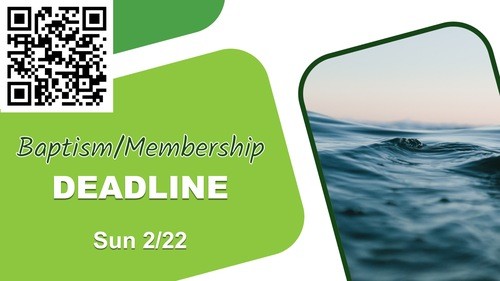 If you're interested in getting baptized or becoming a CBMC member, the deadline is Feb 22nd. Find the application in the CBMC Office. You will also need to enroll in the 3-week Life Series Class (TBD).