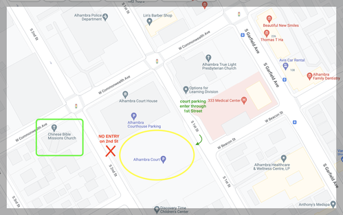 - 法院停車場(請注意:須前往「一街入口」進入,切勿使用「二街出口」進入停車場。)